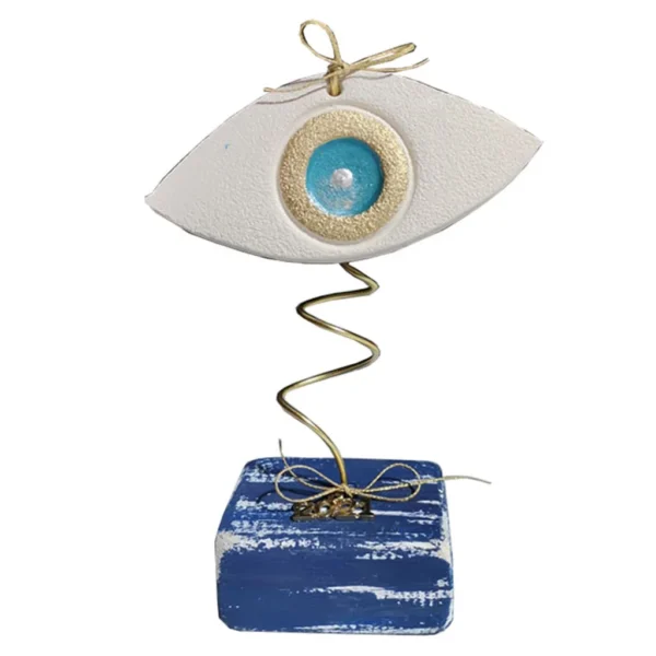 Μινιατούρα με σύρμα και μεγάλο κεραμικό μάτι, σχεδιασμένη για να προσφέρει προστασία και να ανανεώνει τη διακόσμηση με μια μοντέρνα και καλλιτεχνική πινελιά. Το κεραμικό μάτι εντυπωσιάζει με το μέγεθος και τη λάμψη του, ενώ η βάση από διαμορφωμένο σύρμα δημιουργεί μια κομψή και αέρινη κατασκευή που ταιριάζει σε κάθε χώρο. Ιδανική για το σπίτι ή το γραφείο, η μινιατούρα αυτή λειτουργεί ως σύμβολο θετικής ενέργειας, προστασίας και καλής τύχης. Ένα ξεχωριστό διακοσμητικό και υπέροχη επιλογή δώρου για όσους αγαπούν μοναδικά χειροποίητα αντικείμενα.